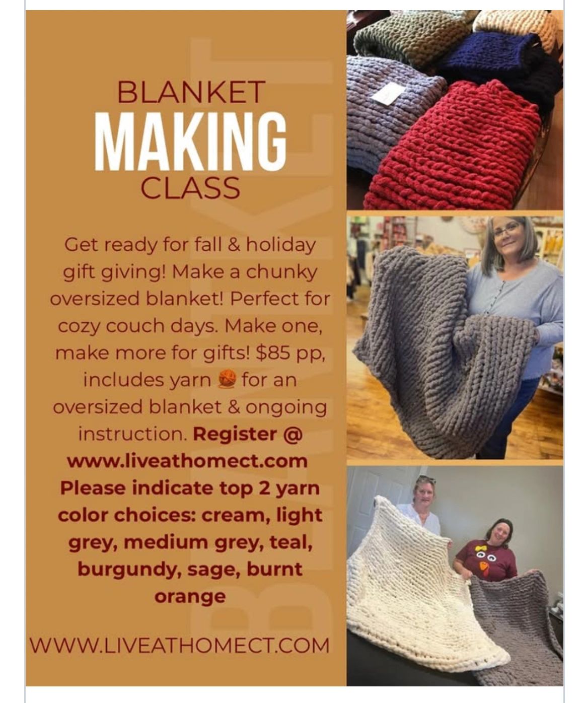 You asked & we answered! Our popular blanket making is back for the season. Create your own oversized chunky blanket that you can later replicate. They make wonderful gifts. Start now & gift them for the holidays! $85 includes instruction (ongoing) & all blanket yarn. Indicate top 2 color choices when registering.